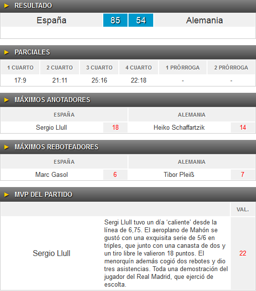 El alto ritmo de juego combinado con las pocas pérdidas (3 al descanso y sólo 8 al final) y el acierto en el tiro exterior (50% en tiros de dos y en triples) resultaron ser un cóctel explosivo para Alemania. Sólo un equipo con el talento de España puede conjugar juntas todas esas habilidades. Los cambios defensivos de Orenga, con defensas alternativas (zona 2-3 e individual) también aportaron confusión al colapsado ataque alemán.El Detalle Técnico