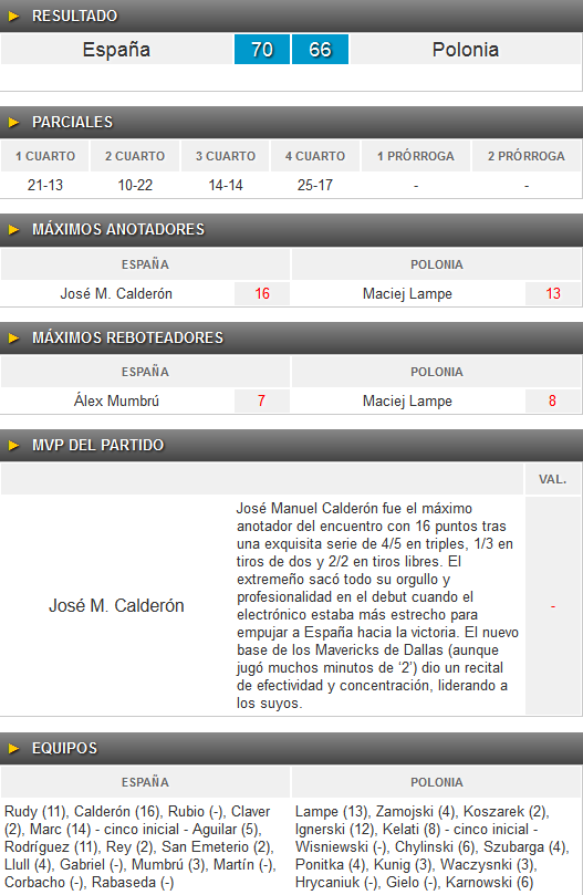 La avanzada puesta a punto de los polacos, el acierto de Lampe (13 puntos y 8 rebotes) y el flojo porcentaje español en el triple hasta el último cuarto pusieron las cosas difíciles en Castellón. El panorama adverso dio la vuelta en el último cuarto cuando Llull, Sergio Rodríguez y compañía empezaron a apretar al límite las primeras líneas de pase, dificultando y colapsando la circulación de balón polaca. A la que España corrió con mejor criterio y entraron los triples la resistencia rival se vino abajo. Las alternativas individual-zona (2-3) también hicieron mella en el ataque de Polonia.
